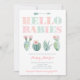 Pastellrosa und Minze Baby Dusche Einladungen mit Aquarellkakteen / prickeligen Birnenbildern. Da der Text "HELLO BABIES" lautet, würde dieses Design gut für Zwillingsbabys oder eine gemeinsame Babydusche funktionieren, wo beide Mütter kleine Mädchen willkommen heißen.