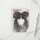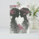 Cute wedding response card for Lesbian, LGBTQ couple. Two hand drawn, silhouette pink and black brides, standing face to face with pink leaf accents. They have their hair up and pink roses in their hair, cute pencil drawing for your special day.