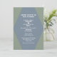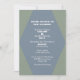 A very modern wedding invitation on a Balsam Fir Green background with a Lucid Blue diamond shape frame of the details.