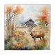 Two deer in mountain landscape with trees and flowers