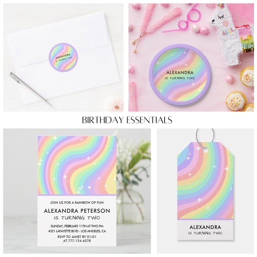 Two Groovy Retro Pastel Rainbow 2nd Birthday PartyDesignt von Sophie Chevalier