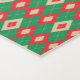 "Two identical sections of colorful geometric pattern; the top is vertical, the bottom horizontal. The design is green, red, white, with circular and diamond shapes on a white background."