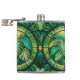 Two metal flasks with vibrant green tropical leaf designs over a geometric pattern. The tone is lush and lively, evoking a sense of nature.