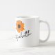 One Large orange daisy / flower on the back and a smaller orange daisy and Your Name / message (example Best Mom) in elegant, casual black hand-written fonts coffee mug / cup