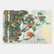 Vintage Christmas illustration of two little robins sitting on a fence with holly berries in the snow.