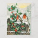 Vintage Christmas illustration of two little robins sitting on a fence with holly berries in the snow.