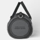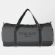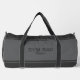 Sleek and monochromatic gym duffel bag design with customizable sports typography in dark gray against a medium gray background. Accented with stripes for a stylish touch.