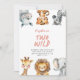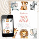 Cute and fun kid's safari animals theme 2nd birthday party invitation featuring illustration of safari animals of giraffe, snow leopard, rhino, lion, elephant, and zebra. The text says "XX is TWO wild." Perfect for a boy's birthday party.