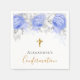 Für eine elegante Bestätigung. Ein schick weißer Hintergrund. Blau-weiße Blumen, Rose und ein vergoldetes Kreuz aus Imitaten. Personalisieren und einen Namen hinzufügen. Schwarze und goldene Buchstaben.