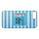 Eine personalisierte Telefonzelle mit einem blau gestreiften Muster. Ein blauer Rahmen mit einem gelben Rahmen überlagert mit einem Aquarellbild eines rot gestreiften Leuchtturms im Inneren. Typografischer Text lautet: Lass dein Licht hell.