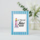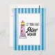 Eine Postkarte mit einem Aquarellbild eines rot gestreiften Leuchtturms. Mit Typografie, die lautet: Lass dein Licht hell leuchten. Blau gestreifter Hintergrund.
