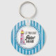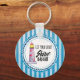 Ein Schlüsselanhänger mit einem blau gestreiften Muster. Ein Kreis mit einem nautischen Thema überlagert mit einem Aquarellbild eines rot gestreiften Leuchtturms im Inneren. Typografischer Text lautet: Lass dein Licht hell.