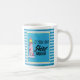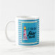 Eine Tasse mit einem blau gestreiften Muster. Ein blauer Rahmen mit einem gelben Rahmen überlagert mit einem Aquarellbild eines rot gestreiften Leuchtturms im Inneren. Typografischer Text lautet: Lass dein Licht hell.