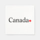 Kanadische Typografie mit Papierservietten aus rotem Ahornblatt aus Party. Schwarzer Serifentext auf weißem Hintergrund mit rotem Ahornblatt. Feiern Sie Ihren kanadischen Stolz mit den roten Papierservietten aus Kanada.