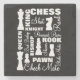 Ein lustiges typografisches Design für jeden, der eine Partie Schach Liebe hat. Die Typografie enthält die Namen der Schachstücke und anderer Schachterminologie mit Silhouetten der sechs verschiedenen Stücke; König, Königin, Ritter, Bischof, Rokk und Pflaster.