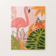 UA Jungle Flamingo II von Juni Erica Vess. Ein Flamingo-Single ist umgeben von naher tropischer Vegetation in einer fröhlichen, hellen Farbpalette.| 133079Z