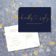 Eine elegante blaue und goldene Herzensschrift antwortet freundlich auf die RSVP-Karte. Auf der Rückseite finden Sie Ihre Details und eine lustige Gesangsanfrage. Entwickelt von Thisisnotme©