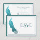 Ein hübscher, Vintager Art-Déco-Stil HochzeitsrSVP Reaktion in aquamarin Grün und Weiß. Eine doppelte Grenze umfasst das Design eines großen Pfaues, der subtil schattig und mit einem dekorativen Schwanz gemustert ist.