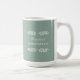 Diese überdimensionale 15 oz Kaffee-Tasse enthält den Ausdruck "Achtsamkeit üben", mit einem einfachen schwarzen Text-Design auf einem staubigen grünen Hintergrund mit Elfenbeinarmen.