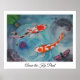 Originelle Aquarellmalerei von Sandra Gale mit Blick auf einen Koi-Süßwasserteich. Das türkisblaue Wasser hat zwei extravagante Koi-Fische, die um eine violette Wasserlilie-Blume schwimmen, während eine seltsame Libelle über sie treibt. Das Design ist perfekt für diejenigen, die die Natur, Teiche und Koi Fisch mögen.
