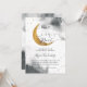 Dreamy geschlechtsneutrale Babydusche Einladungskarte mit Aquarellkunst aus grauem Himmel mit Imitaten, goldenen Mond und Sternen. Im Text steht: "Wir sind über dem Mond."