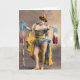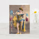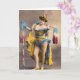 Vintages Foto einer Frau in einem wilden blau-gelb gestreiften Leotard, einem gelben Band, das um ein Bein umhüllt ist, und einem rot-weiß-blauen Accessoire