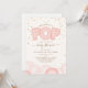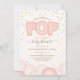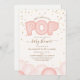 Eine Babydusche-Einladung mit einer Illustration von rosa Ballons mit dekorativem Text "She's about to POP" und Konfetti-Design. Personalisieren Sie den Text mit Details zu Ihrem Anlass.