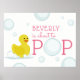 Ein Babyduschplakat mit einer Abbildung einer Gummiente und Bläschen, die in den Text "Über den POP" eingearbeitet sind. Personalisieren Sie den Namen. Die passende Babydusche und die passenden Pflegeartikel sind in der Jill's Paperie erhältlich.