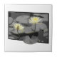 Dieses Bild zeigt zwei zarte Wasserlilien in sanften, blassgelben Farbtönen, die vor einem Hintergrund von gedämpften, graustufigen Lilienpolstern und Wasser lebhaft stehend werden. Die Blume reichen über den schwarzen Rahmen hinaus und erzeugen einen dynamischen, fast dreidimensionalen Effekt. Der Kontrast zwischen den pulsierenden Blüten und der gedämpften Umgebung unterstreicht die sanfte Schönheit und Ruhe der Szene, die ein Gefühl der Ruhe und Eleganz hervorruft.