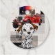 Ein Vintager roter Feuerwehrlader wird auf einem Collage-Stil mit geometrischen Mustern und abstrakten Designs dargestellt. Im Vordergrund sorgt ein bezaubernder Cartoon-Dalmatiner mit ausdrucksvollen Augen für eine spielerische Touch. Digitale Kunstfotografie CS5