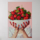 Ein auffallendes hyperrealistisches Bild einer Schüssel, die mit frischen, glitzernden Erdbeeren überflutet wird und von zarten Händen mit lebendigen roten Nägeln gehalten wird. Der weiche, rosa Hintergrund und die weißen Rüffelärmel bilden einen harmonischen Kontrast und verstärken die üppigen roten Farbtöne der Frucht. Dieses Kunstwerk erfasst das Wesen von Genuss und Schönheit in einer visuell atemberaubenden Komposition.