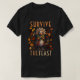 Das Design zeichnet sich durch einen humanoiden Truthahn stehend aufrecht, der in einer durchdachten, reflektierenden Pose verschmolzen ist. Sein Ausdruck ist ruhig, aber humorvoll, als ob man sein Schicksal während des Erntedanks in Betracht ziehen würde. In der Umgebung des Truthahns sind verstreute gefallene Blätter in lebhaften Herbsttönen in Rot, Orange, Gelb und Braun verteilt, was eine festliche saisonale Touch hinzufügt. Die Wörter "Überleben" und "das Fest" sind fett geschrieben, wobei "Überleben" über dem Truthahn gewölbt und "das Fest" unten platziert wird und das Design in einer spielerischen, ausgewogenen Komposition abbildet. Dieses witzige und visuell ansprechende Design verbindet Spaß mit Erntedank und eignet sich somit hervorragend für T - Shirt oder Merchandise.
