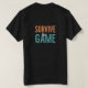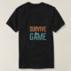 Ein kühner, stilisierter Schriftart dominiert das Zentrum des Shirts und liest "ÜBERLEBEN SIE DAS SPIEL" in einer bedrohlichen, blutroten Farbe. Um den Text herum ist ein chaotisches, abstraktes Muster gezackter Linien und Formen, das eine postapokalyptische oder dystopische Welt suggeriert. Das Gesamtkonzept vermittelt ein Gefühl von Gefahr, Dringlichkeit und der Notwendigkeit des Überlebens in einem feindseligen Umfeld.
