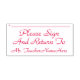 Dieses angesehene Design aus Gummi-Briefmarke beinhaltet die Meldung "Bitte unterschreiben und zurück", zusammen mit einer Zeile für eine Unterschrift oder Initialen, die oben geschrieben werden sollen. Es enthält auch einen individuellen Lehrernamen. Es könnte von einem Lehrer, Erzieher oder Tutor genutzt werden, um Eltern oder Vormund eines Schülers fragen, sich die Arbeit eines Schülers an einem Projekt, einer Prüfung, einer Arbeit oder einem anderen Schulauftrag zu überlegen.