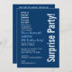 Dieses moderne Design in marineblau-weiß ist eine elegante Art, Ihre Gäste zu einer SURPRISE Geburtstagsparty einzuladen. Alle Texte sind individuell anpassbar. Sie können die Hintergrundfarbe oder die Textfarbe für ein anderes Aussehen ändern. Obwohl dieses Design auf einem Grundpapier vorgestellt wird, empfehle ich das Leinenpapier, das Ihnen eine elegantere Touch verleiht, oder das hochglänzende metallische Papier, das Ihren Einladungen einen festlichen Schimmer und Glanz verleiht.