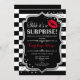 Überraschung Einladung zum Geburtstag. Elegantes Schwarz-weißes Design mit Imitaten Glitzer Silber. Verfügt über Rote Lippen Kuss, Schwarz-weiße Streifen, Konfetti und Skript-Schriftart. Ideal für eine elegante Geburtstagsfeier. Kann in jedem Alter angepasst werden! Nachricht, wenn Sie weitere Anpassungen benötigen.