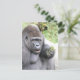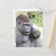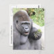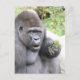 Foto eines Westerns Lowland Gorilla, der beim Essen auf eine Kamera umgestellt wurde und mit einem überraschenden oder schockierenden Aussehen gefangen wurde.