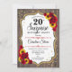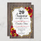 Überraschung 20. Geburtstag Einladung. Weibliche rustikale Schwarz, Weiß, Rot-Design mit Imitaten Glitzer Gold. Verfügt über Holzmuster, rote Rosen, Sonnenblumen, Skript-Schriftart und Konfetti. Ideal für eine elegante Geburtstagsfeier. Kann personalisiert sein, jedes Alter zu zeigen. Nachricht, wenn Sie weitere Anpassungen benötigen.