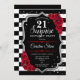 Überraschung 21. Geburtstag Einladung. Weibliches Schwarz, Weiß, Rot-Design mit Imitaten Glitzer Silber. Enthält schwarz-weiße Streifen, rote Rosen, Skript-Schriftart und Konfetti. Ideal für eine elegante Geburtstagsfeier. Kann personalisiert sein, jedes Alter zu zeigen. Nachricht, wenn Sie weitere Anpassungen benötigen.