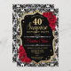 Überraschung 40. Geburtstag Einladung. Weibliches Schwarz, rotes Design mit Imitaten Glitzer Gold. Enthält Damask-Muster, rote Rosen, Skript-Schriftart und Konfetti. Ideal für eine elegante Geburtstagsfeier. Kann personalisiert sein, jedes Alter zu zeigen. Nachricht, wenn Sie weitere Anpassungen benötigen.
