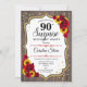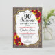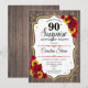Überraschung 90. Geburtstag Einladung. Weibliche rustikale Schwarz, Weiß, Rot-Design mit Imitaten Glitzer Gold. Verfügt über Holzmuster, rote Rosen, Sonnenblumen, Skript-Schriftart und Konfetti. Ideal für eine elegante Geburtstagsfeier. Kann personalisiert sein, jedes Alter zu zeigen. Nachricht, wenn Sie weitere Anpassungen benötigen.