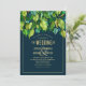 Kreatives Hochzeitsdesign mit reichlich Blattwerk, das in einer modernen Art und Weise gezeichnet wird, die eine metallische Textur imitiert. Die Farbtöne Grün, Gold, Kupfer, Platin, Türkis, Dunkelblau. Tief blauer Hintergrund. Goldbuchstaben (Gold ist kein echtes Gold, sondern Farbe). Moderne, stromlinienförmige Schriftart. Wirklich einzigartig, involviert und elegant. Für Hochzeit im Herbst, Hochzeit im Sommer, Hochzeit im Garten oder jede Art von moderner Hochzeit.