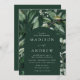 Elegante Hochzeitseinladungen mit Ihren Hochzeitsdetails, eingebettet in einem gewölbten Rahmen, umgeben von Eukalyptus, Farne und anderen üppigen Grünpflanzen mit dunkelgrünem Hintergrund. Die botanischen Botanischen Bogen Hochzeitseinladungen kehren zu einem soliden dunkelgrünen Hintergrund zurück. Entworfen, um sich mit unserer Hochzeitskollektion "Abundant Greenery" abzustimmen.