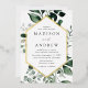 Elegante Einladungen für Hochzeiten, die Ihre Hochzeitsdetails in einem goldenen Rahmen inmitten von Eukalyptus, Farne und anderen üppigen Grünpflanzen enthalten. Die modernen botanischen Hochzeitseinladungen kehren zu einem soliden, dunkelgrünen Hintergrund zurück. Entworfen, um sich mit unserer Hochzeitskollektion "Abundant Greenery" abzustimmen.