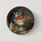 Ein Button, das in einer farbenfrohen Anordnung von Blume in einer Glasvase und einer Fruchtauswahl auf einem Marmorsockel gehalten ist. Zu den Blume zählen Rose, Lilien und Tulpen, während die Frucht Trauben, Pfirsiche und Pflaumen umfasst. Das Gemälde stammt vom österreichischen Künstler Eduard Wuger aus dem 19. Jahrhundert.