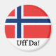 Round magnet featuring the flag of Norway and "Uff da!" which is Norwegian for a sigh of resignation at the situation. Express your inner Norsk!