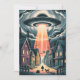 This dramatic illustration depicts a UFO hovering above a quiet suburban street at dusk, casting a vivid orange-yellow beam over houses and a lone figure observing the spectacle. Rich, moody colors of deep blues, purples, and grays contrast with the glowing beam, creating a retro-inspired, surreal atmosphere. Bold outlines and stylized details make this artwork perfect for fans of sci-fi, mysterious phenomena, and cinematic night scenes.
