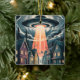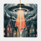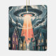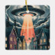 This dramatic illustration depicts a UFO hovering above a quiet suburban street at dusk, casting a vivid orange-yellow beam over houses and a lone figure observing the spectacle. Rich, moody colors of deep blues, purples, and grays contrast with the glowing beam, creating a retro-inspired, surreal atmosphere. Bold outlines and stylized details make this artwork perfect for fans of sci-fi, mysterious phenomena, and cinematic night scenes.