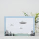 Aquarell, Stift und Tinte, Farbstift gezeichnet von drei sauceren UFOs über den Bergen.