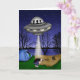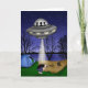 Handgezeichnete Alien Art. UFO versucht, ein Mensch Camping durch den See im Wald zu entführen. Die Karte ist innen leer, sodass Sie Ihre eigene Nachricht hinzufügen können, um es zu einem Geburtstag, Jubiläum zu machen oder über Ihre Karte nachzudenken.